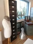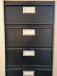 Metal column ten flaps storage cabinet workshop, office, kitchen. Matte black color wood trim.