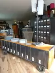 TV stand x Column with ten waxed pickled flaps, on heavy duty industrial wheels and wooden tray. Industrial style TV stand in metal and wood.